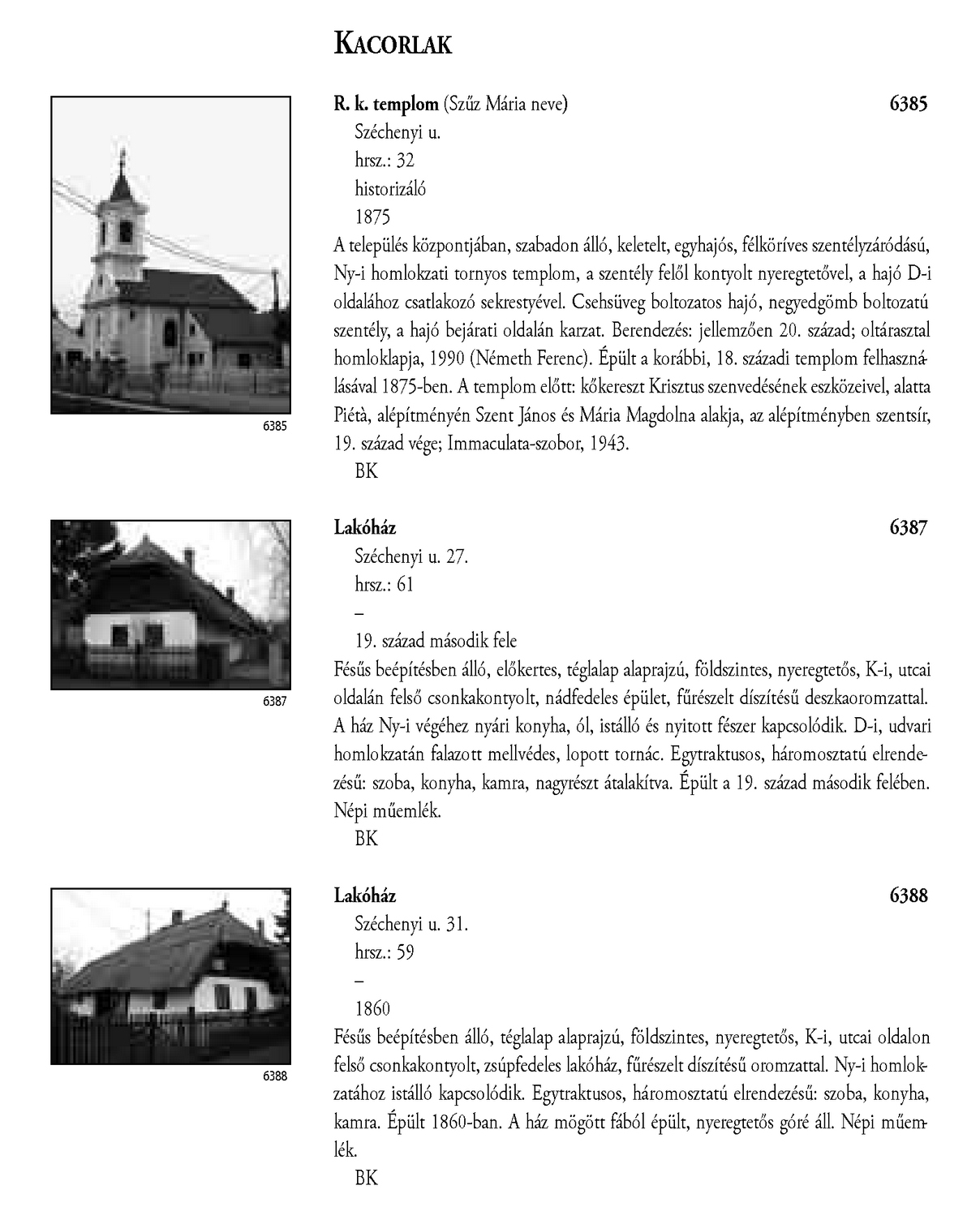 Nyilvános 2208 | 4850 | Kacorlak - Magyarország műemlékjegyzéke - Zala megye 2006 036old | A részlet szövege: KACORLAK R. k. templom (Szűz Mária neve) 6385 Széchenyi u. hrsz.: 32 historizáló 1875 A település központjában, szabadon álló, keletelt, egyhajós, félköríves szentélyzáródású, Ny-i homlokzati tornyos templom, a szentély felől kontyolt nyeregtetővel, a hajó D-i oldalához csatlakozó sekrestyével. Csehsüveg boltozatos hajó, negyedgömb boltozatú szentély, a hajó bejárati oldalán karzat. Berendezés: jellemzően 20. század; oltárasztal homloklapja, 1990 (Németh Ferenc). Épült a korábbi, 18. századi templom felhasználásával 1875-ben. A templom előtt: kőkereszt Krisztus szenvedésének eszközeivel, alatta Piétà, alépítményén Szent János és Mária Magdolna alakja, az alépítményben szentsír, 19. század vége; Immaculata-szobor, 1943. BK Lakóház 6387 Széchenyi u. 27. hrsz.: 61 – 19. század második fele Fésűs beépítésben álló, előkertes, téglalap alaprajzú, földszintes, nyeregtetős, K-i, utcai oldalán felső csonkakontyolt, nádfedeles épület, fűrészelt díszítésű deszkaoromzattal. A ház Ny-i végéhez nyári konyha, ól, istálló és nyitott fészer kapcsolódik. D-i, udvari homlokzatán falazott mellvédes, lopott tornác. Egytraktusos, háromosztatú elrendezésű: szoba, konyha, kamra, nagyrészt átalakítva. Épült a 19. század második felében. Népi műemlék. BK Lakóház 6388 Széchenyi u. 31. hrsz.: 59 – 1860 Fésűs beépítésben álló, téglalap alaprajzú, földszintes, nyeregtetős, K-i, utcai oldalon felső csonkakontyolt, zsúpfedeles lakóház, fűrészelt díszítésű oromzattal. Ny-i homlokzatához istálló kapcsolódik. Egytraktusos, háromosztatú elrendezésű: szoba, konyha, kamra. Épült 1860-ban. A ház mögött fából épült, nyeregtetős góré áll. Népi műemlék. BK A részlet a következő könyv online változatából származik: Cím: Magyarország műemlékjegyzéke Közreműködő: Haris Andrea. (szerk.) ; Kulturális Örökségvédelmi Hivatal (Budapest) (közread.) ; Somorjay Sélysette. (szerk.) ; Bardoly István (közrem.) Szerz. közl.: [sorozatszerk. Haris Andrea, Somorjay Sélysette] ; [mtárs Bardoly István] ; [közread. a] Kulturális Örökségvédelmi Hivatal. Kiadás: Budapest : KÖH, 2006 Kötetadat: Zala megye ISBN: 963-86510-7-5 ö ISBN: 963 7474 10 2 Nyelv: magyar A jegyzék a Kultúrális Örökségvédelmi Hivatal honlapján, a következő link alatt található: http://www.koh.hu/index.php?_mp=nyitolap&_amp=MUEML A fejléc adatairól 1. Objektum neve – törzsszám A fejléc első sora a műemlék eredeti rendeltetésének megfelelő nevet tartalmazza. Mögötte zárójelben templom esetében annak titulusa, más épületeknél indokolt esetben az eredeti rendeltetéstől eltérő, mai használatra utaló intézmény név (pl. városháza, múzeum, szálloda, oktatási intézmény hivatalos neve, stb.) olvasható. A törzsszám (trsz.) a műemlék egyetlen soha nem változó adata. A gyors azonosítás, illetve a törzsszám szerinti keresés lehetősége végett az objektummal egy sorban, a fejléc jobb szélén kiemelten jelenik meg. Összetartozó műemlék részek vagy történetileg egy együttest alkotó műemlékek sokszor külön törzsszámon lettek műemlékké nyilvánítva. Előfordulhat ezért, hogy egy fejléc alatt a leíró részben több, külön törzsszámmal rendelkező objektum szerepel. A törzsszámot ezekben az esetekben is az objektummal egy sorban tüntetjük fel. 2. Utca, házszám Egy utcán belül, amennyiben a számozás ezt lehetővé teszi, először a templomot adjuk meg, ezt követi a parókia, majd egyéb objektumok, pl. szobrok következnek. Házszám nélkül említünk egyes műemlékfajtákat (elsősorban templomokat), amennyiben a topográfiai azonosítás szempontjából a házszám közömbös vagy éppen zavaró. Előfordul, hogy a műemlék nem köthető nevesített közterülethez. Az ilyeneket a település végéhez soroltuk, és a leírásban kitértünk a településen belül elfoglalt helyükre. 3. Helyrajzi szám Ha egy helyrajzi számon és egy címen (pl. temetőben) több, külön törzsszámmal védett objektum van, akkor az együttesre utaló műemlék megnevezés alatt a közös adatokat egyszer adjuk meg. Ezt követően külön címszavanként következik a műemlékek leírása. Ilyen esetben az emlékeket mutatóztuk. Ezt az eljárást követtük, tekintet nélkül arra, hogy a teljes együttes védett-e vagy sem. (Védett együttes mellett mindig törzsszám szerepel.) Ha több helyrajzi szám is tartozik egy törzsszámhoz, akkor a fejlécben valamennyi számot feltüntettük. Amennyiben ilyen esetben több elemből álló műemlékről van szó, akkor a leíró részben minden külön említett elem után zárójelben megadjuk a vonatkozó helyrajzi számot. 4. Stílus A műemléket jelenleg meghatározó, domináns stílusjegy alapján került meghatározásra. Egyéb, érzékelhető stíluselemekre a leíró részben utalunk. 5. Datálás A műemléket jelenleg leginkább jellemző építési dátum. Korábbi építési periódusokra, illetve későbbi átépítésekre a történeti részben utalunk, fennmaradt részletek esetén lehetőség szerint azokra vonatkoztatva. A leírás A műemlékek leírása tartalmilag öt szakaszból áll, amely folyamatos szövegként jelenik meg. Az objektum topográfiai meghatározása a műemlék településen belüli vagy ahhoz viszonyított helyét adja meg, amennyiben ez az azonosításhoz nélkülözhetetlen, avagy azt segíti. Az emlék jellegének leírása utal a környezettel való kapcsolatra (tájolás, beépítés módja, környező terepviszonyok, amennyiben ezek jellemzőek), alaprajzi elrendezésre, tömegre és a jellegzetes homlokzati elemekre (pl. rizalitok, erkélyek, stb.). Részletes homlokzatleírás nem v