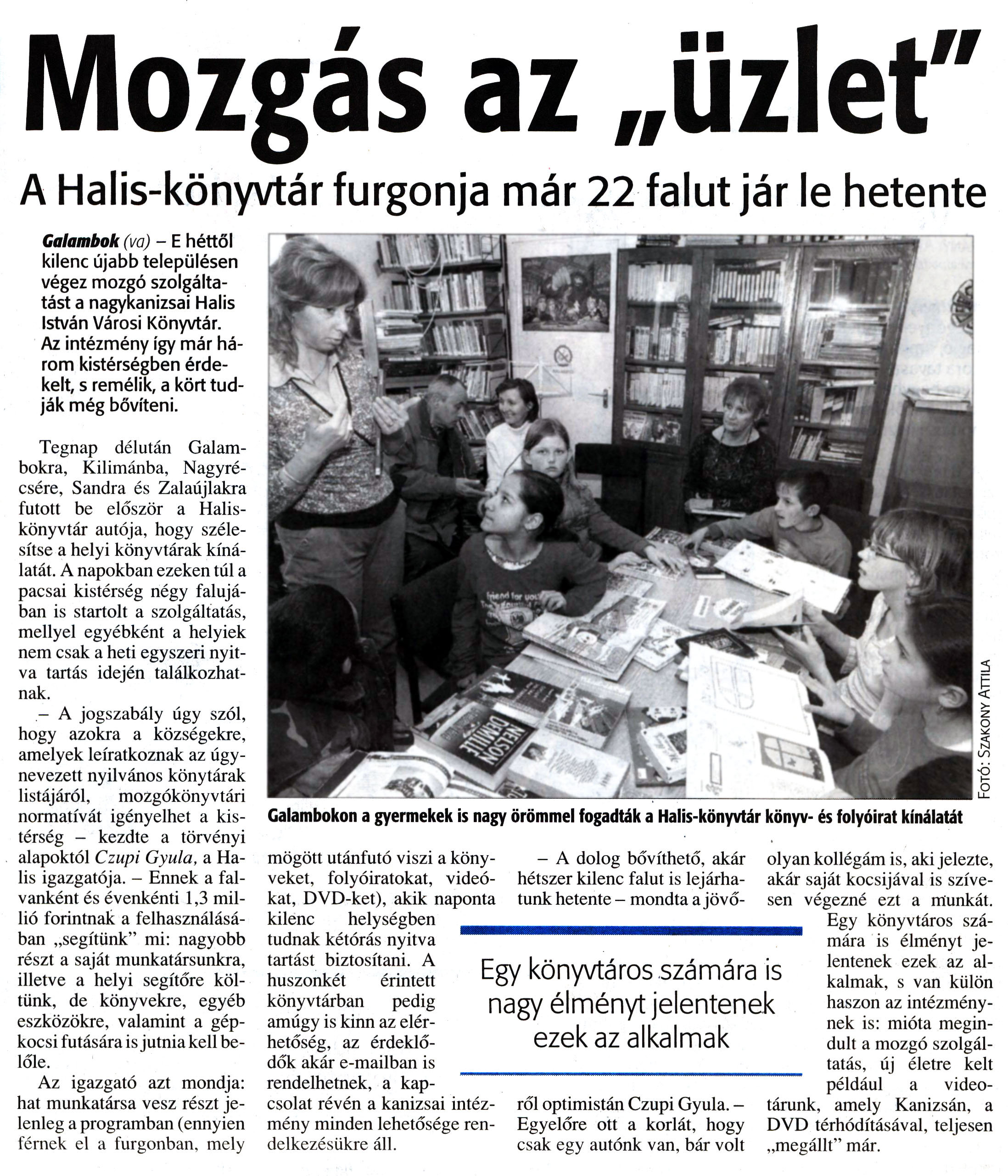 Nyilvános 7498 | 15130 | Zalai Hírlap 2008. március 14. 4. oldal - Mozgás az üzlet | Mozgás az „üzlet" A Halis-könyvtár furgonja már 22 falut jár le hetente Galambok (va) - E héttől kilenc újabb településen végez mozgó szolgáltatást a nagykanizsai Halis István Városi Könyvtár. Az intézmény így már három kistérségben érdekelt, s remélik, a kört tudják még bővíteni. Tegnap délután Galambokra, Kilimánba, Nagyrécsére, Sandra és Zalaújlakra futott be először a Halis-könyvtár autója, hogy szélesítse a helyi könyvtárak kínálatát. A napokban ezeken túl a pacsai kistérség négy falujában is startolt a szolgáltatás, mellyel egyébként a helyiek nem csak a heti egyszeri nyitva tartás idején találkozhatnak. - A jogszabály úgy szól, hogy azokra a községekre, amelyek leiratkoznak az úgynevezett nyilvános könytárak listájáról, mozgókönyvtári normatívát igényelhet a kistérség — kezdte a törvényi alapoktól Czupi Gyula, a Halis igazgatója. - Ennek a falvanként és évenkénti 1,3 millió forintnak a felhasználásában „segítünk" mi: nagyobb részt a saját munkatársunkra, illetve a helyi segítőre költünk, de könyvekre, egyéb eszközökre, valamint a gépkocsi futására is jutnia kell belőle. Az igazgató azt mondja: hat munkatársa vesz részt jelenleg a programban (ennyien férnek el a furgonban, mely mögött utánfutó viszi a könyveket, folyóiratokat, videókat, DVD-ket), akik naponta kilenc helységben tudnak kétórás nyitva tartást biztosítani. A huszonkét érintett könyvtárban pedig amúgy is kinn az elérhetőség, az érdeklődők akár e-mailban is rendelhetnek, a kapcsolat révén a kanizsai intézmény minden lehetősége rendelkezésükre áll. - A dolog bővíthető, akár hétszer kilenc falut is lejárhatunk hetente - mondta a jövőről optimistán Czupi Gyula. - Egyelőre ott a korlát, hogy csak egy autónk van, bár volt olyan kollégám is, aki jelezte, akár saját kocsijával is szívesen végezné ezt a munkát. Egy könyvtáros számára is élményt jelentenek ezek az alkalmak, s van külön haszon az intézménynek is: mióta megindult a mozgó szolgáltatás, új életre kelt például a video-tárunk, amely Kanizsán, a DVD térhódításával, teljesen „megállt" már. |