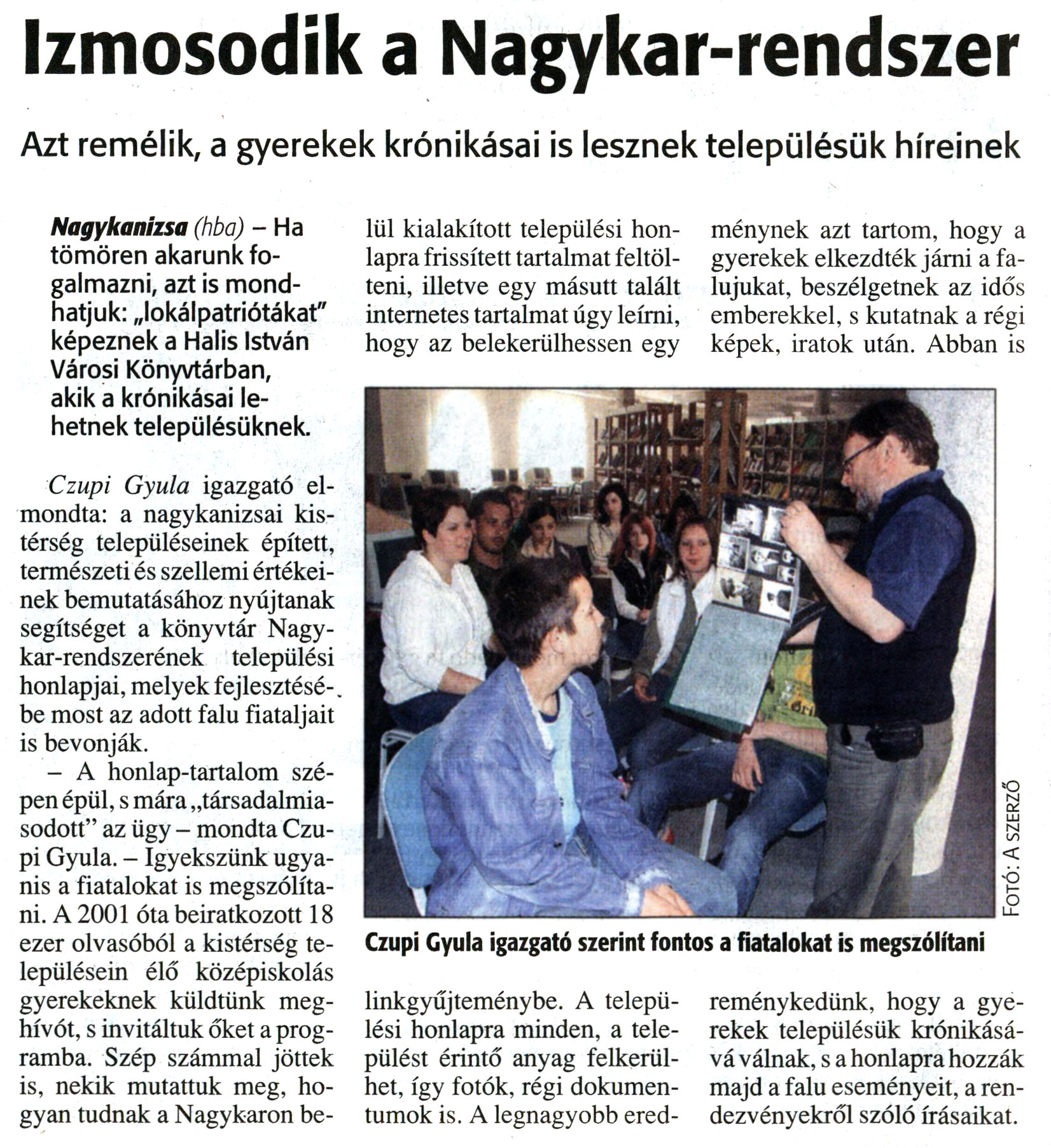 Nyilvános 14355 | 28647 | Zalai Hírlap 2008. június 9. 133. szám 12. oldal - Izmosodik a Nagykar-rendszer | A cikk szövege: Izmosodik a Nagykar-rendszer Azt remélik, a gyerekek krónikásai is lesznek településük híreinek Nagykanizsa (hba) - Ha tömören akarunk fogalmazni, azt is mondhatjuk: „lokálpatriótákat" képeznek a Halis István Városi Könyvtárban, akik a krónikásai lehetnek településüknek. Czupi Gyula igazgató elmondta: a nagykanizsai kistérség településeinek épített, természeti és szellemi értékeinek bemutatásához nyújtanak segítséget a könyvtár Nagykar-rendszerének települési honlapjai, melyek fejlesztésébe most az adott falu fiataljait is bevonják. - A honlap-tartalom szépen épül, s mára „társadalmiasodott" az ügy - mondta Czupi Gyula. - Igyekszünk ugyanis a fiatalokat is megszólítani. A 2001 óta beiratkozott 18 ezer olvasóból a kistérség településein élő középiskolás gyerekeknek küldtünk meghívót, s invitáltuk őket a programba. Szép számmal jöttek is, nekik mutattuk meg, hogyan tudnak a Nagykaron belül kialakított települési honlapra frissített tartalmat feltölteni, illetve egy másutt talált internetes tartalmat úgy leírni, hogy az belekerülhessen egy linkgyűjteménybe. A települési honlapra minden, a települést érintő anyag felkerülhet, így fotók, régi dokumentumok is. A legnagyobb eredménynek azt tartom, hogy a gyerekek elkezdték járni a falujukat, beszélgetnek az idős emberekkel, s kutatnak a régi képek, iratok után. Abban is reménykedünk, hogy a gyerekek településük krónikásává válnak, s a honlapra hozzák majd a falu eseményeit, a rendezvényekről szóló írásaikat. Képaláírás: Czupi Gyula igazgató szerint fontos a fiatalokat is megszólítani |