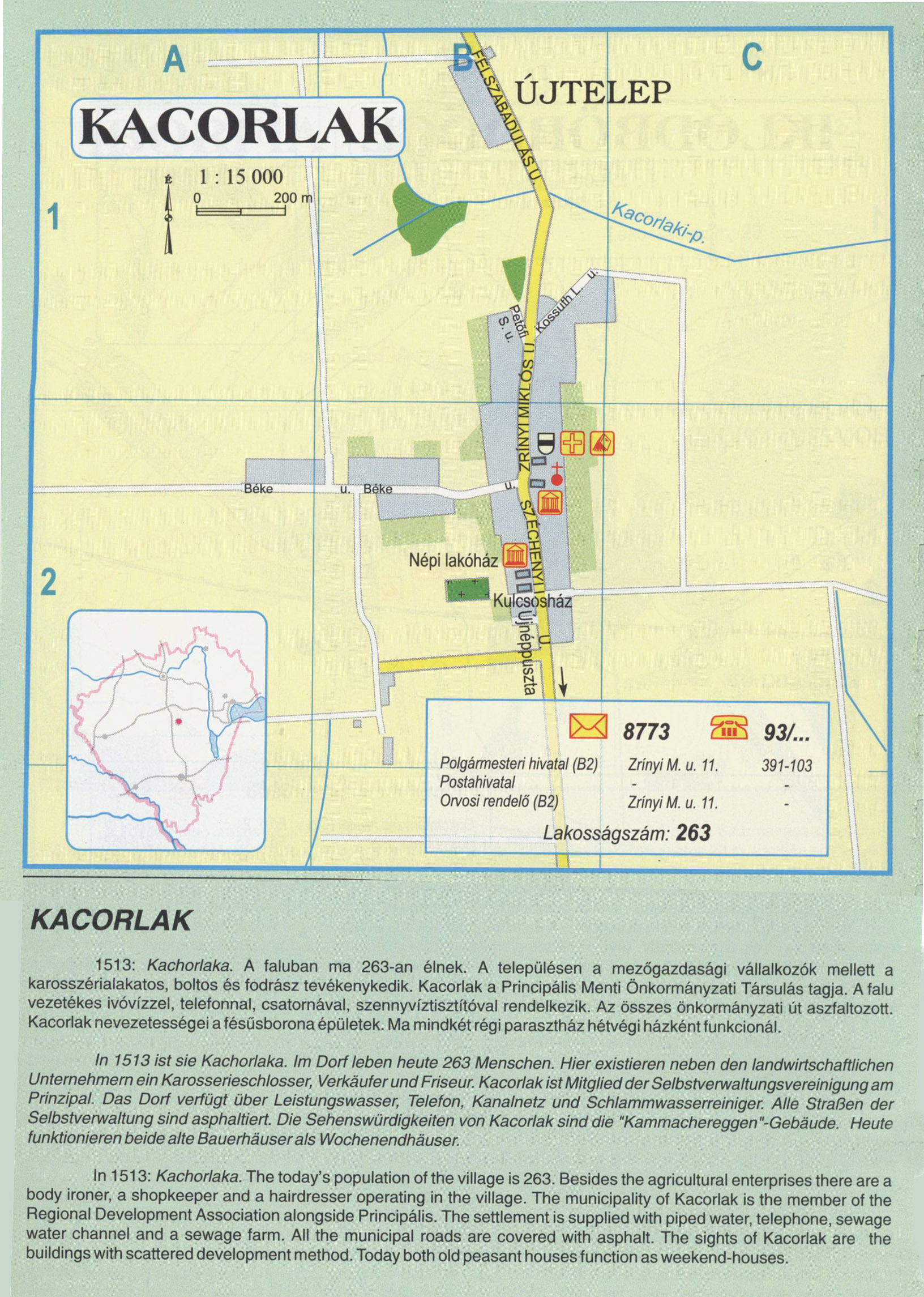 Nyilvános 3042 | 10992 | KACORLAk | 1513: Kachorlaka. A faluban ma 263-an élnek. A településen a mezőgazdasági vállalkozók mellett a karosszérialakatos, boltos és fodrász tevékenykedik. Kacorlak a Principális Menti Önkormányzati Társulás tagja. A falu vezetékes ivóvízzel, telefonnal, csatornával, szennyvíztisztítóval rendelkezik. Az összes önkormányzati út aszfaltozott. Kacorlak nevezetességei a fésűsborona épületek. Ma mindkét régi parasztház hétvégi házként funkcionál. In 1513 ist sie Kachorlaka. Im Dorf leben heute 263 Menschen. Hier existieren neben den landwirtschaftlichen Unternehmern ein Karosserieschlosser, Verkäufer und Friseur. Kacorlak ist Mitglied der Selbstverwaltungsvereinigung am Prinzipal. Das Dorf verfügt über Leistungswasser, Telefon, Kanalnetz und Schlammwasserreiniger. Alle Straßen der Selbstverwaltung sind asphaltiert. Die Sehenswürdigkeiten von Kacorlak sind die "Kammachereggen "-Gebäude. Heute funktionieren beide alte Bauerhäuser als Wochenendhäuser. In 1513: Kachorlaka. The today\'s population of the village is 263. Besides the agricultural enterprises there are a body ironer, a shopkeeper and a hairdresser operating in the village. The municipality of Kacorlak is the member of the Regional Development Association alongside Principális. The settlement is supplied with piped water, telephone, sewage water channel and a sewage farm. All the municipal roads are covered with asphalt. The sights of Kacorlak are the buildings with scattered development method. Today both old peasant houses function as weekend-houses. A részlet a következő kiadványból származik/Die Teile stammen vom volgenden Buch/This text came from the following book: Cím/Titel/Title: Zala megye településeinek atlasza - 257 település részletes térképe/Atlas der Komitat Zala - 257 Detailte Siedlungskarten/Zala county\'s Atlas - 257 settlement maps. Közreműködő/contributor: Lackner László (1943) (fotó) Kiadás/Ausgabe/Publisher: Gyula : HISZI-MAP, 1997 Sorozat/Serie/Series: Indulástól - megérkezésig... ETO: 912(439.121-2) ; 908.439.121 Cutter: Z 19 ISBN: 963-610-025-4 Oldalszám/Seiten/Pages: 323, 81 p. Megjegyzés/Note: Lezárva/Abgeschlossen am/Closed am: 1997. máj. 30. |